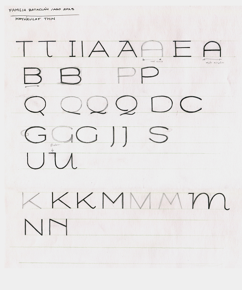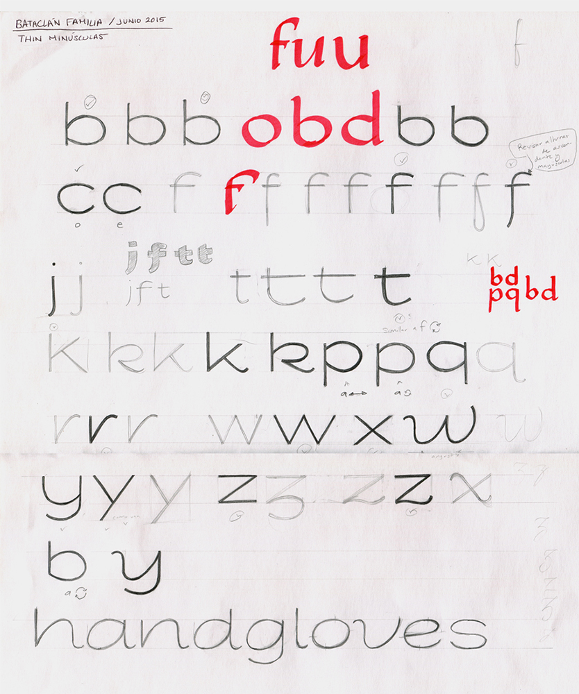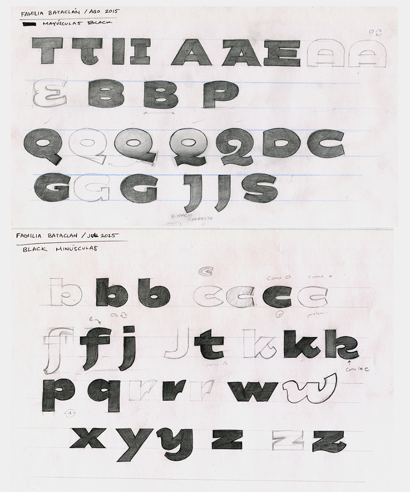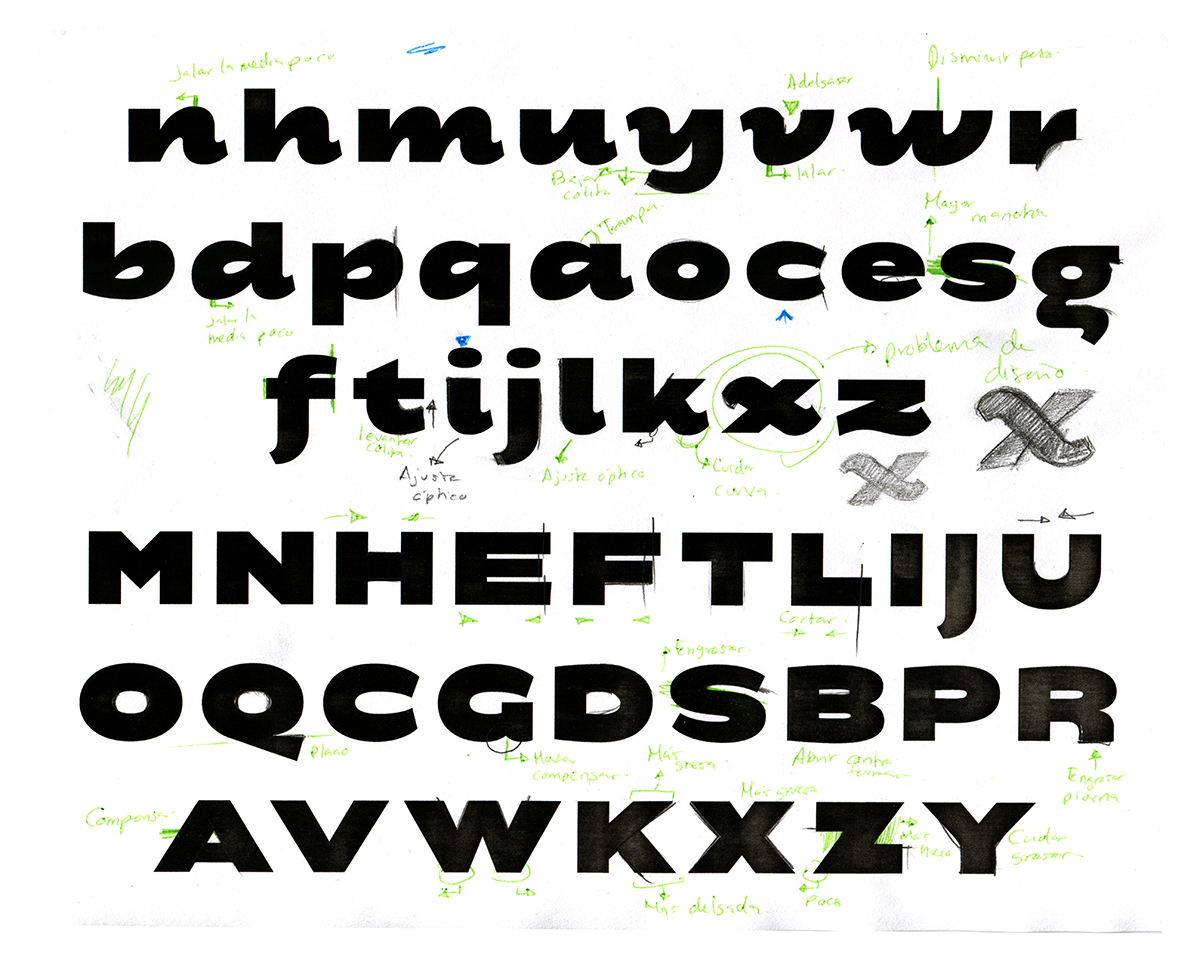 Plasmé estas ideas a bocetos que me permitieran estudiar la coherencia del sistema y después en formas vectoriales. El escenario digital permitió compartir ideas mucho más definidas al equipo de Latinotype con quienes tuve constante retroalimentación para definir las mejoras alternativas en la familia.