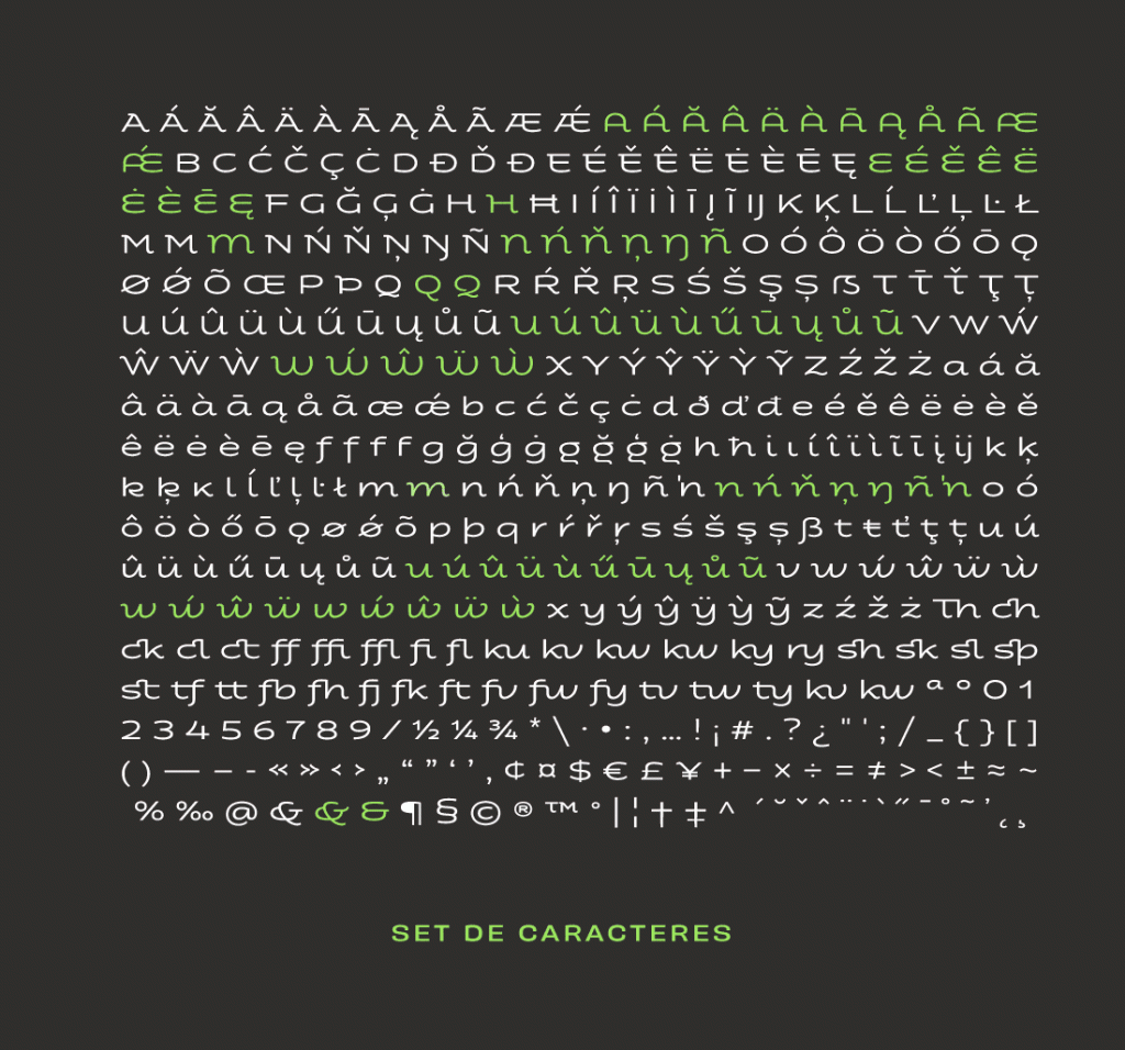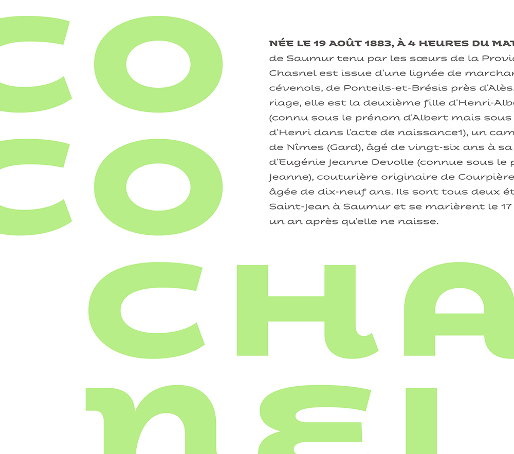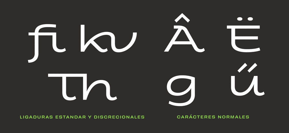 El equipo de Latinotype funcionó como guía técnico y propuso ideas de formas, terminaciones y extensiones que permitieron agilizar el proceso. La fuente se convirtió entonces en un proyecto diseñado en conjunto. El resultado final es una familia de 6 variantes de peso y más de 2900 caracteres con un sabor ecléctico y nostálgico. Incluye ligaduras estándar y discrecionales y un amplio conjunto de sustituciones estilísticas que acentúan la inspiración Art Decó con cierto sabor unicase en el caso de las sustituciones en mayúsculas.